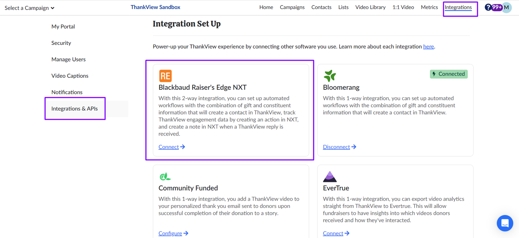 Using the Blackbaud RE NXT integration, you can add contacts to a ThankView campaign, list, or send a video with Blackbaud workflows and track the results. The integration may take 15-30 minutes to set up.