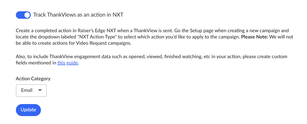 - On the Integrations page, toggle on Track ThankViews as an actions in NXT and click Update.