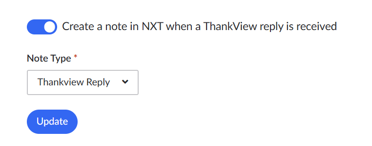 - On the Integrations page, toggle on Create a note in NXT when a ThankView reply is received and click Update.