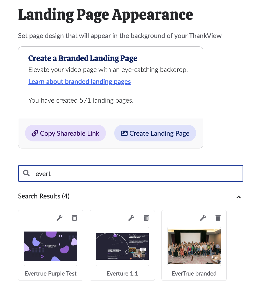 If you have not already, click Create Landing Page to create your own branded landing page. If you have already done this, select one of your landing pages. To easily find a landing page, try using our search bar. The search bar dynamically updates as you enter search terms.