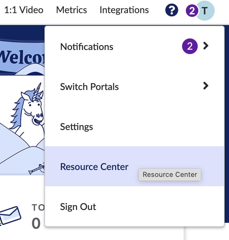 2) 'Resource Center' link in your profile dropdown in the top right corner of your portal